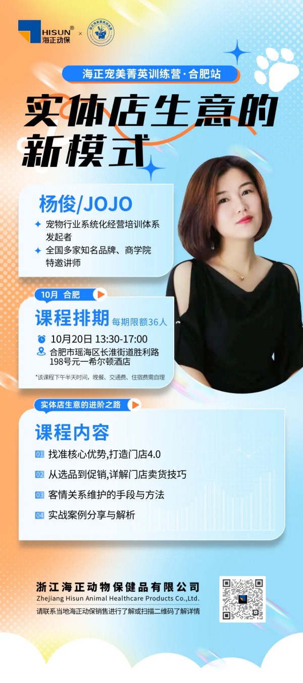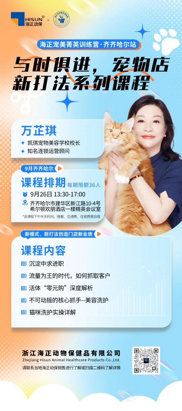 宠美菁英训练营线下实效课 01 CHONGMEI 9.26 /齐齐哈尔站 对比南北方宠物市场和客户需求的差异化特点,本期课程凯琪宠物美容学校校长万芷琪老师和学员们相互交流碰撞,在借鉴南方相对成熟完善的宠物门店运营管理体系上,本地门店如何把握机遇,万老师带来了新思路和新打法! 万老师表示,随着市场的发展,宠物门店已进入3.0时代,专属的“人宠互动空间”已成为打开人流密码的第一把钥匙。同时在流量为王时代,充分了解各自媒体和即时零售平台的曝光、推流机制,在做好内容的基础上打造宣传矩阵,精准客户定位,掌握生意增长的第二把钥匙。 作为支撑门店运营的重要抓手,美容洗护是重中之重!不仅要加强工作人员的基础技能和知识储备——了解不同品种、不同发质的应对方法,更要在洗前预检、气味管理、抱猫手法等细节方面做到专业。 万老师强调,舒欣宝可以有效缓解猫咪在到店洗护过程中的应激情绪,让洗护更加轻松。 10月课程精彩内容抢先看 02 CHONGMEI 10.20/合肥站 在沉重的市场压力下,宠物门店如何破局求生,实现生意积极增长?宠物行业系统化经营培训体系发起者JOJO老师将带你走进实体店生意的全新模式 海正动保宠美菁英训练营将持续以专业课程与行业资源,助力每一位从业者成为行业标杆! 如有需要可联系海正动保区域销售!