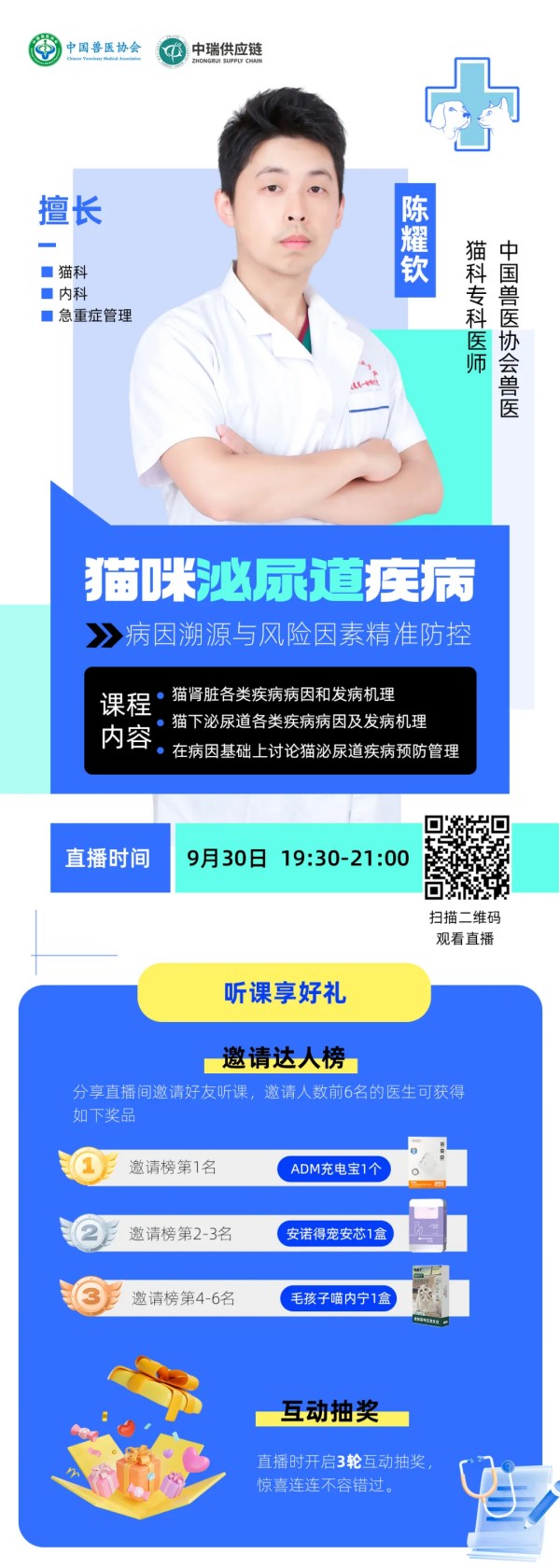 各位兽医师同仁们看过来!解锁猫咪泌尿道疾病防控方法的直播来啦! 01 课程信息 9月30日19:30 - 21:00,兽医猫科专科医师陈耀钦,他是芭比堂爱心动物医院主治兽医师,擅长猫科、内科、急重症等相关领域的诊疗。他将带来直播——《猫咪泌尿道疾病:病因溯源与风险因素精准防控》 课程内容 直播里,他会解析猫肾脏各类疾病病因和发病机理,以及猫下泌尿道各类疾病病因及发病机理,并且在病因基础上讨论猫泌尿道疾病预防管理方案。 03 直播福利 更有福利!分享直播间邀请好友听课,邀请人数前6名的医生能获得ADM充电宝、安诺得宠安芯、毛孩子喵内宁等好礼;直播时还有3轮互动抽奖,惊喜不断~ 扫描下方海报二维码,即可预约直播,千万别错过这场干货满满的直播!