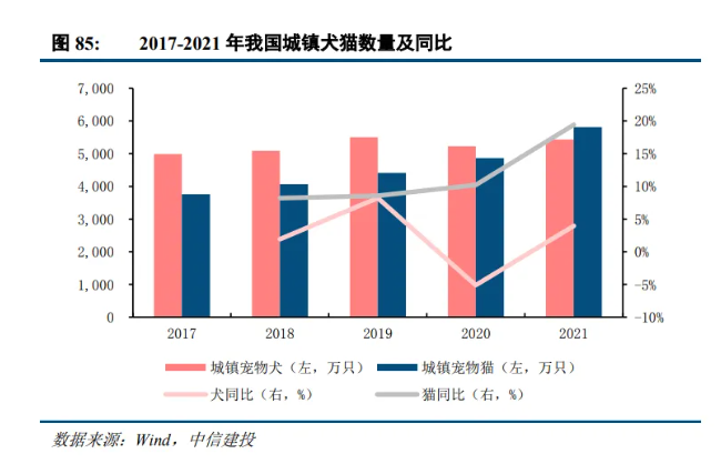 从发展空间上看,2021 年我国城镇犬猫数量同比增长 11.41%,犬猫平均单宠消费增长 9.3%,预计 2022 年宠物数量和单宠消费将保持增长,此 外,宠物“拟人化”特点不断突出,“毛孩子”观念不断渗透,宠物市场消费升级利好宠物动保发展,宠物动保 增长空间较大。
