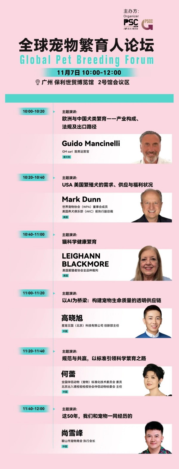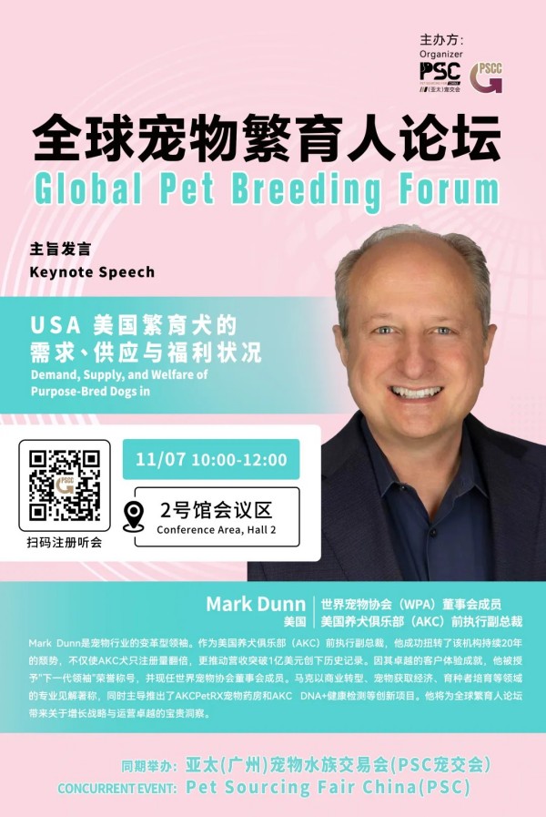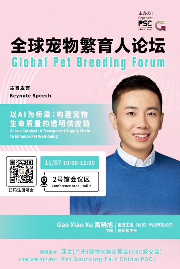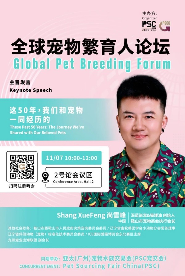 2025 年 11 月 5-7 日,广州 保利世贸博览馆举办的第二届 PSC 宠交会(Pet Sourcing Fair China),将迎来一场突破性的行业盛会 ——首届全球宠物繁育人论坛!作为 PSC 宠交会同期首次重磅打造的繁育领域专项论坛,本次活动将于 11 月 7 日 10:00-12:00 在 2 号馆会议区(Conference room, Hall 2)开启,汇聚中、意、美三国 6 位顶尖专家,从法规、技术、福利、趋势四大维度,拆解全球繁育产业核心议题,为中国繁育人搭建链接世界的专业交流平台。