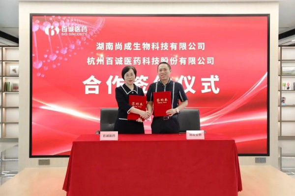 近日,杭州百诚医药科技股份有限公司(以下简称“百诚医药”)与湖南尚成生物科技有限公司(以下简称“尚成生物”)正式签署战略合作框架协议。尚成生物董事长申海彪与百诚医药董事长楼金芳共同签署协议,这标志着双方将在兽药领域展开深度合作,共同探索产业升级新路径。