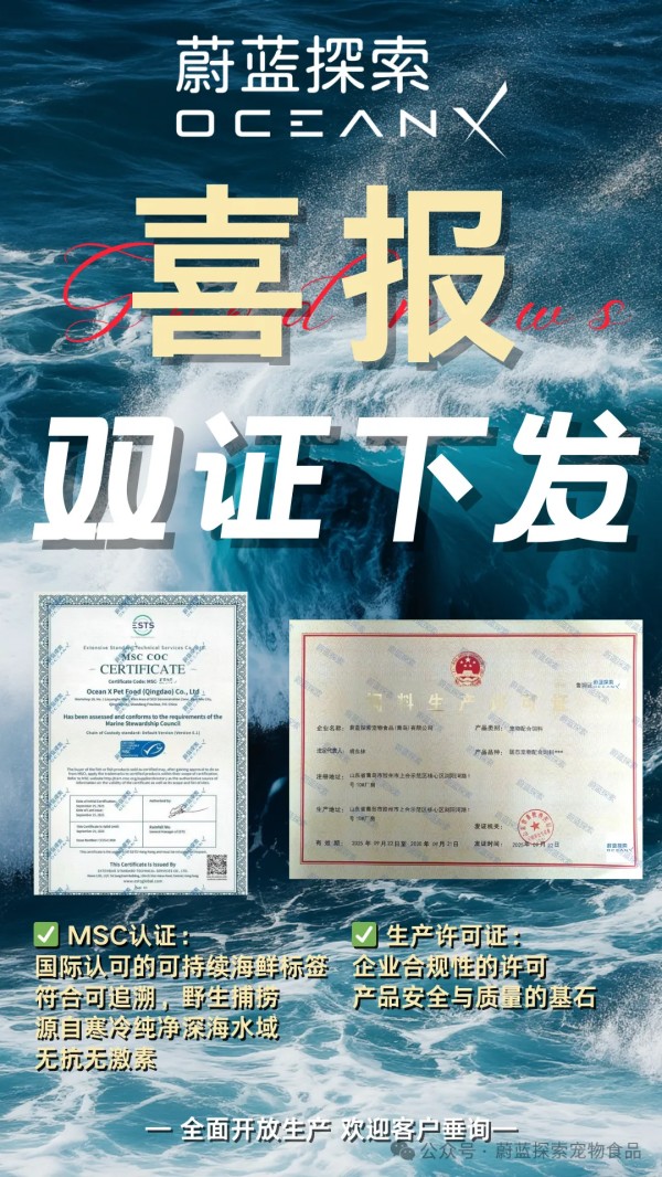 蔚蓝探索OceanX 近期官宣正式获得两大证件,包含国际认可的可持续海鲜标签,符合可追溯,野生捕捞,源自寒冷纯净深海水域,无抗无激素的MSC认证以及企业合规生产许可的生产许可证。发与市场拓展。