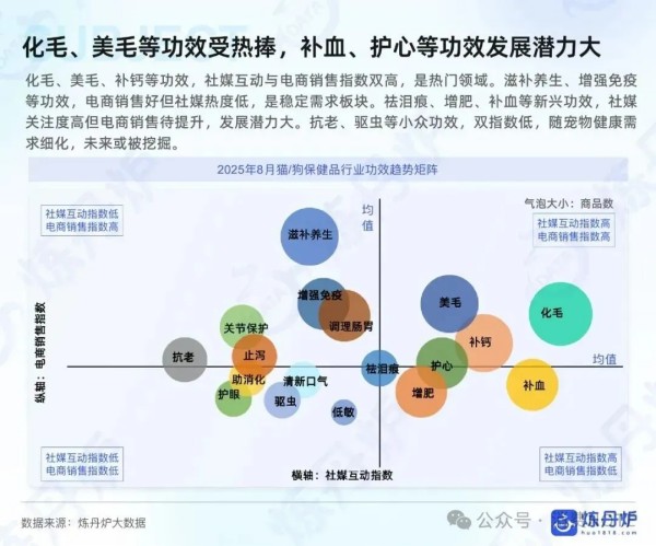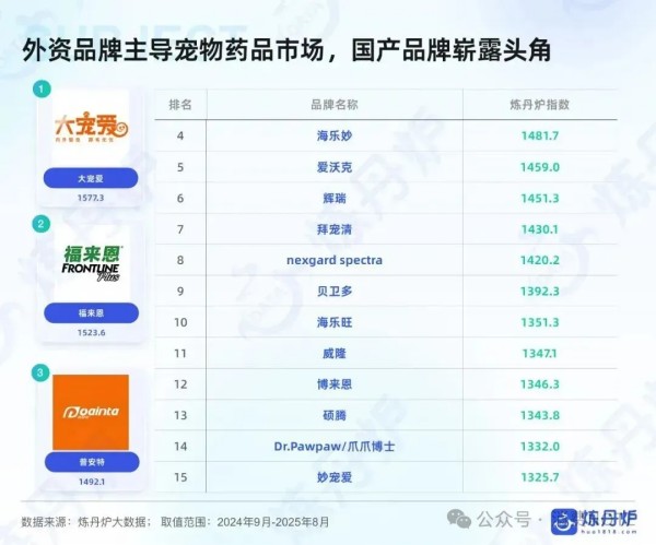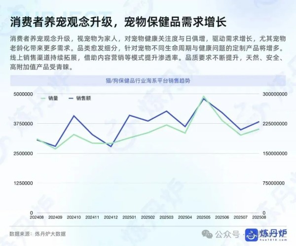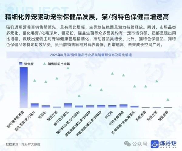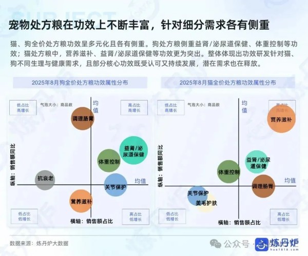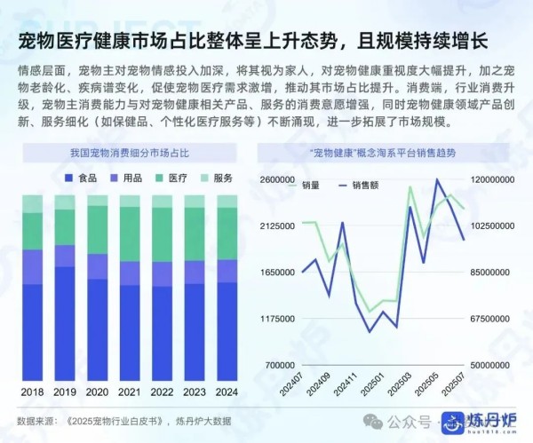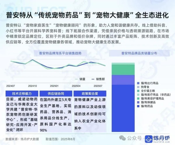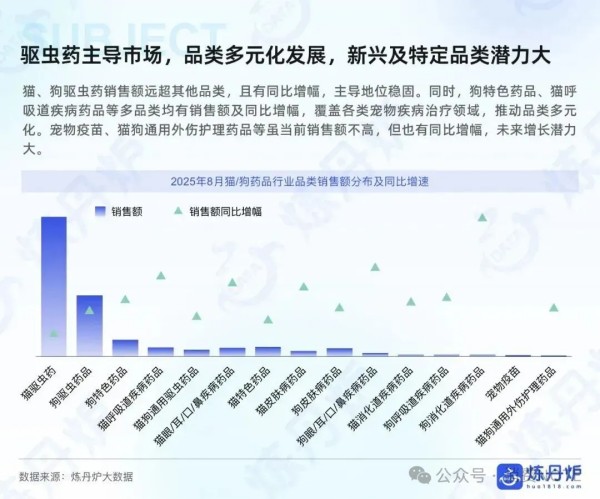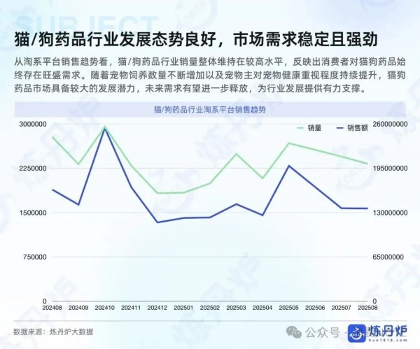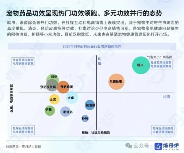 细分市场呈现差异化特征。猫/狗药品市场需求释放,淘系平台销量和销售额增长显著,驱虫类药品(如海乐妙、福来恩)品牌认可度高,护眼等小众功效品类潜力待挖掘。
