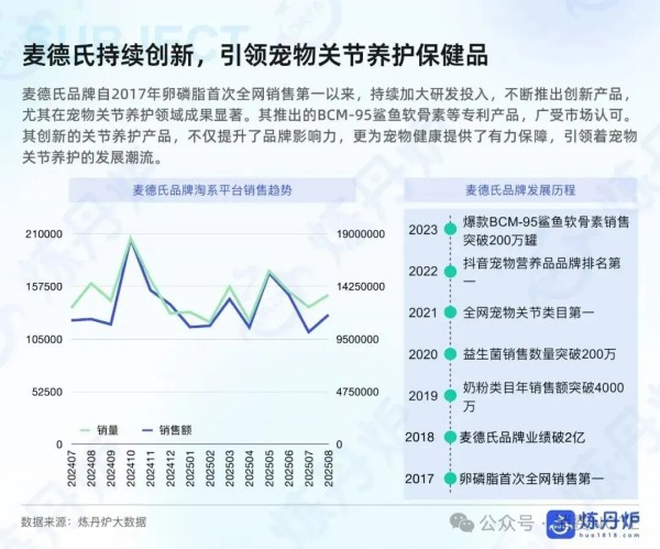 猫/狗保健品市场高附加值产品受青睐,营养膏等传统品类稳定增长,关节养护、抗衰老等特色保健品增速快,原料多元化发展,卫仕、麦德氏等品牌领先,麦德氏2024年业绩破2亿,产品覆盖多功效且价格带灵活。