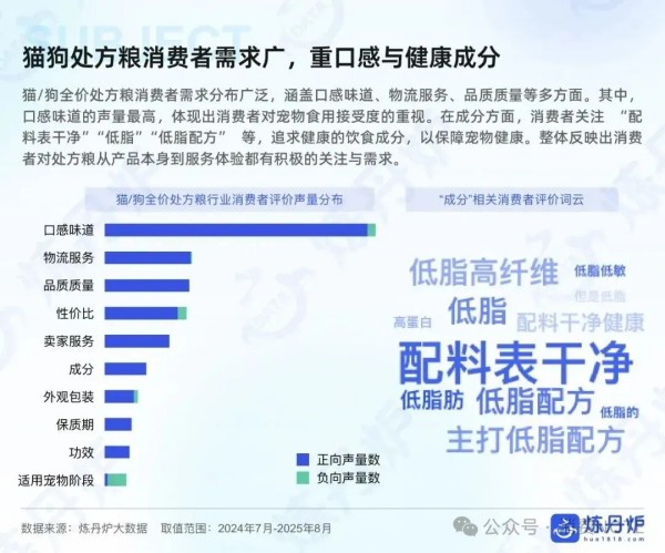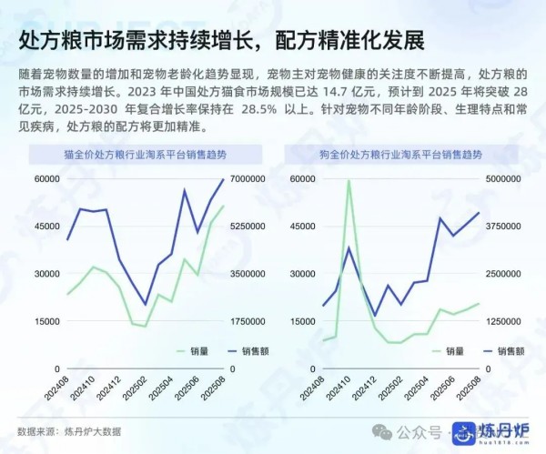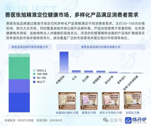 猫/狗全价处方粮市场精准匹配宠物健康需求,针对肠胃、泌尿等病症的处方粮需求明确,皇家、兽医张旭等品牌市场认可度高,消费者关注成分、功效与性价比,兽医张旭低脂处方粮销量居国产首位,价格策略覆盖大众与高端市场。