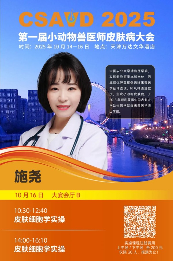 第一届小动物兽医师皮肤病大会开幕倒计时1天! 2025年10月14日-16日,在天津万达文华酒店,来自国内外的小动物皮肤病专业人士将共同见证中国小动物皮肤病领域的历史性时刻。 为期三天的纯粹学术日程,聚焦小动物皮肤病众多领域,内容涵盖ISCAID新指南作者解读、细菌性皮肤病的治疗、耳道疾病的诊断、猫心因性皮肤病的解读、食物过敏治疗的新进展等。为你开启一场高水准、国际化的专业之旅! 中文注册通道 International Delegates Only 大会日程 参会指南 为了保证您在为期三天的精彩会议的参会体验, 请阅读以下交通、住宿等信息!