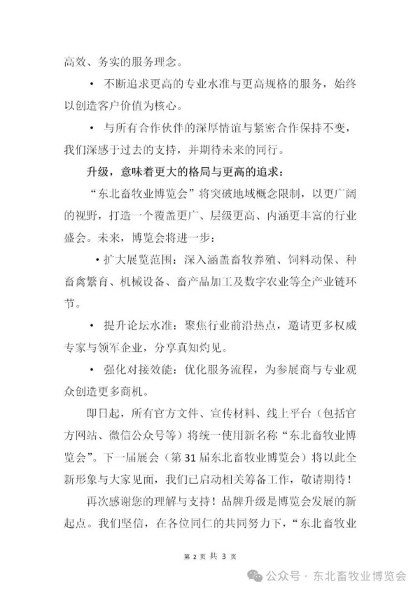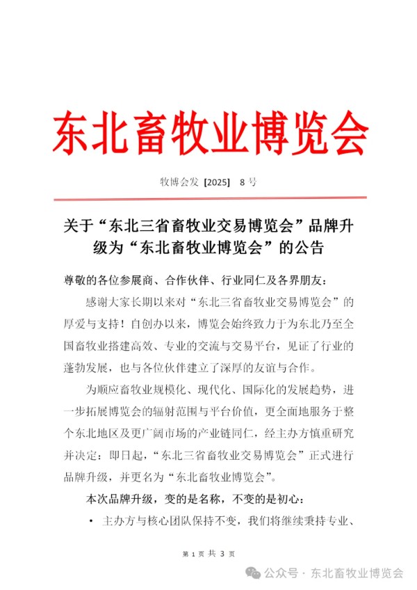 即日起,所有官方文件、宣传材料、线上平台将统一使用新名称 “东北畜牧业博览会”。