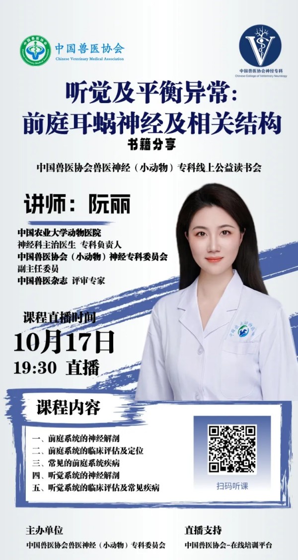 线上公益读书会 本期中国兽医协会兽医神经(小动物)专科线上公益读书会即将开启——10月17日19:30分享《听觉及平衡异常:前庭耳蜗神经及相关结构》。 本期讲师 本次我们邀请到中国农业大学动物医院神经科主治医生、中国兽医协会(小动物)神经专科委员会副主任委员阮丽。 本期主要内容 解析前庭系统和听觉系统的神经解剖、临床评估及常见疾病等内容。 无论你是宠物主人还是兽医从业者,都能从中收获犬猫耳部神经与健康知识。 扫描海报中的二维码即可听课,快分享给身边的兽医同行,一起在知识的海洋中探索小动物神经学的奥秘吧! 本节课程设有一次小测试,考试方法参照下图。