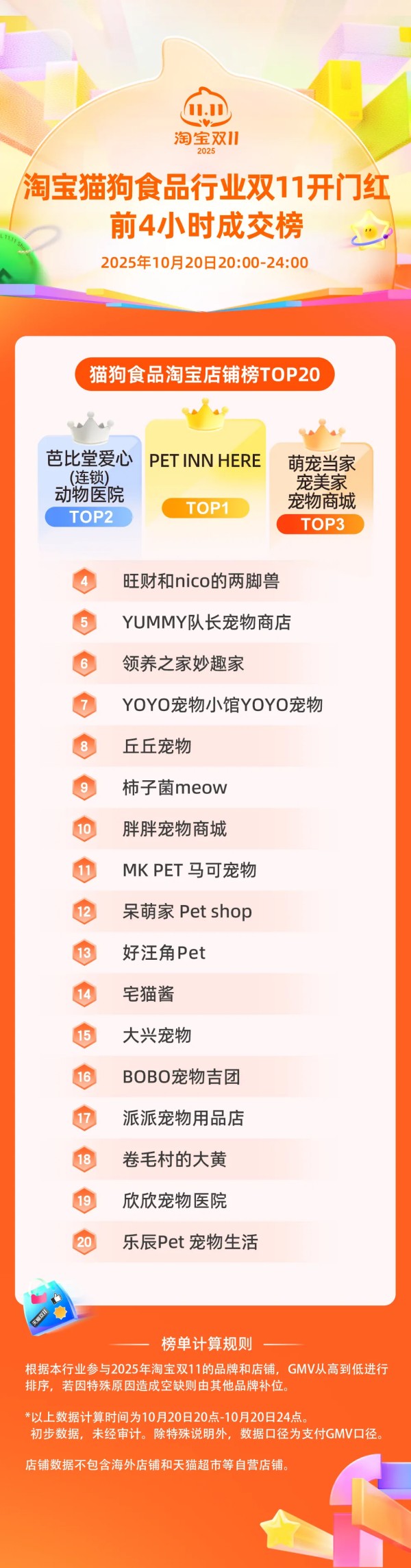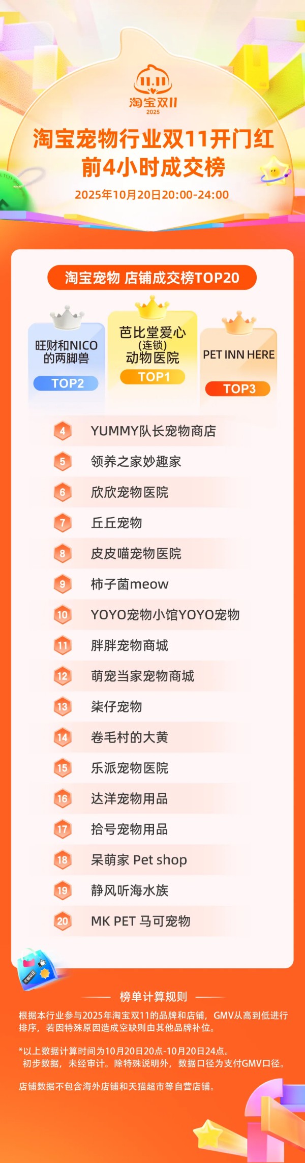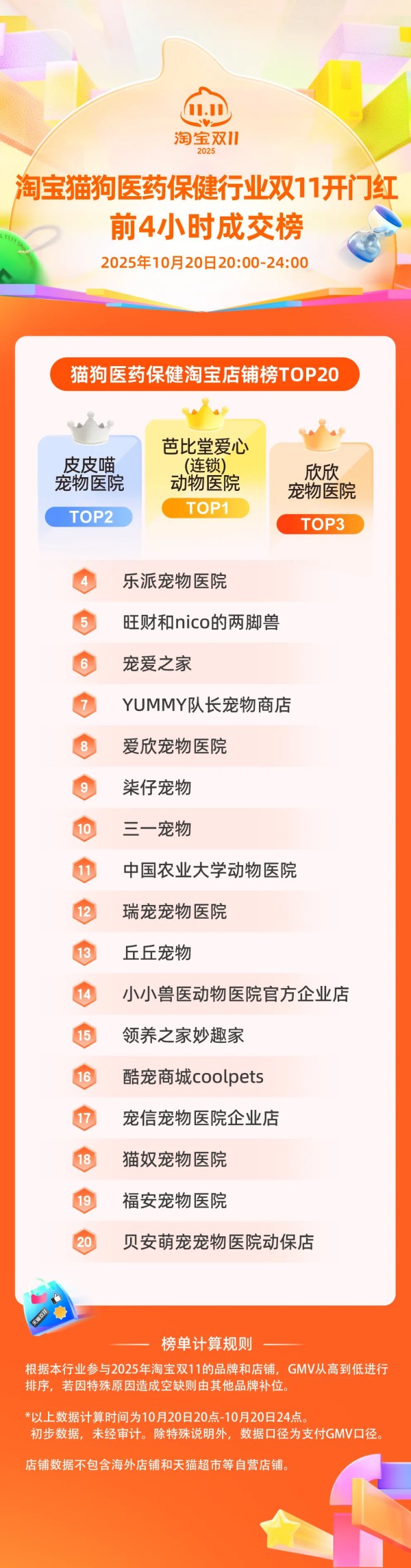 淘宝宠物行业双11开门红前4小时成交榜,店铺成交榜TOP10分别是:芭比堂爱心(连锁)动物医院、旺财和NICO的两脚兽、PET INN HERE、YUMMY队长宠物商店、领养之家妙趣家、欣欣宠物医院、丘丘宠物、皮皮喵宠物医院、柿子菌meow、YOYO宠物小馆YOYO宠物。