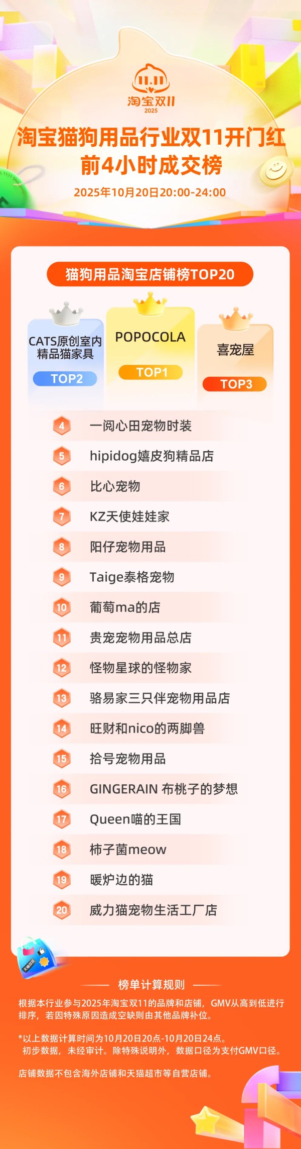 淘宝猫狗用品淘宝店铺榜TOP10:POPOCOLA、CATS原创室内精品猫家具、喜宠屋、一阅心田宠物时装、hipidog嬉皮狗精品店、比心宠物、KZ天使娃娃家、阳仔宠物用品、Taige泰格宠物、葡萄ma的店。