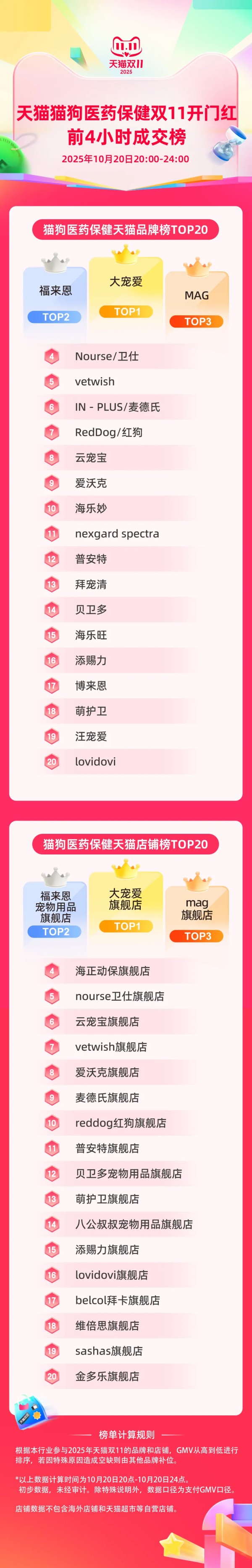 天猫猫狗医药保健天猫店铺榜TOP10:大宠爱旗舰店、福来恩宠物用品旗舰店、mag旗舰店、海正动保旗舰店、nourse卫仕旗舰店、云宠宝旗舰店、vetwish旗舰店、爱沃克旗舰店、麦德氏旗舰店、reddoq红狗旗舰店。