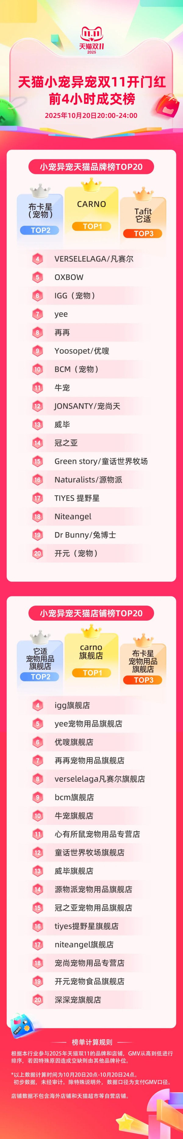 天猫小宠异宠天猫店铺榜TOP10:carno旗舰店、它适宠物用品旗舰店、布卡星宠物用品旗舰店、igg旗舰店、yee宠物用品旗舰店、优嗖旗舰店、再再宠物用品旗舰店、verselelaga凡赛尔旗舰店、bcm旗舰店、牛宠旗舰店。