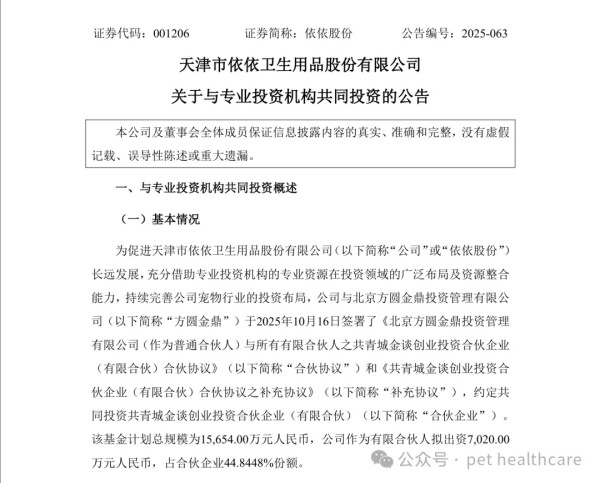 10 月 16 日依依股份宣布与北京方圆金鼎投资管理有限公司(以下简称 “方圆金鼎”)共同投资共青城金谈创业投资合伙企业。该基金计划总规模 15,654.00 万元人民币,依依股份作为有限合伙人拟出资 7,020.00 万元人民币,占合伙企业 44.8448% 份额。主要投资标的为瑞派宠物医院管理股份有限公司。