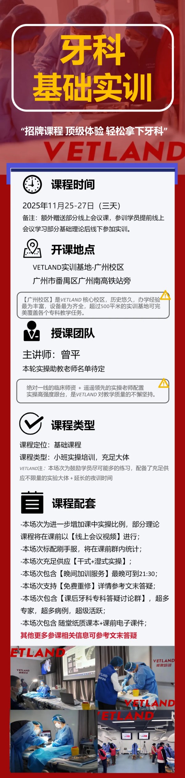 讲师介绍 曾平 国家执业兽医师 中国小动物医学分会会员 粤港澳优秀青年兽医师 广东省畜牧兽医学会小动物医学分会牙科组主任 国内首批欧兽牙科学系列认证学习 亚太区小动物根管手术专项认证学习 2012-2018 深圳芭比堂趣致总院院长 2019-2021 深圳联合宠物医院 猫友好专科院长 2021-至今 广州联合宠物医院 海珠分院院长 VETLAND牙科学系列课程讲师 VETLAND牙科跟诊指定导师 受邀为维克、皇家、瑞沃德、德铭联众、聚行健齿、东西部大会等多家机构讲授齿科系列课程 专业特长:动物齿科相关手术,拔牙术,犬猫牙科影像,牙体修复,牙周手术,根管手术,义齿,正畸,口腔皮瓣术,口腔肿瘤手术等 报 名 方 式 报名费用: 3680元/人 ,两人团购价:3380元/人 * 转发本链接至朋友圈或兽医群 并配文“威狼牙科经典实训班组团!” 可再额外减免80元! * 学费含午餐自选套餐,不含住宿费,广州校区合作酒店住宿费参考【高级大床房100元/晚,高级双床房120元/晚(可拼房AA每人60元/晚)】 * VETLAND 注:严格限制总人数,招牌课名额有限,欲参加本轮请抓紧。 联系人: 广州-朱老师 13416412581(微信同号) 陈老师 18825189069(微信同号) ↓【请长按扫码咨询客服微信】↓