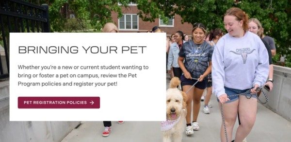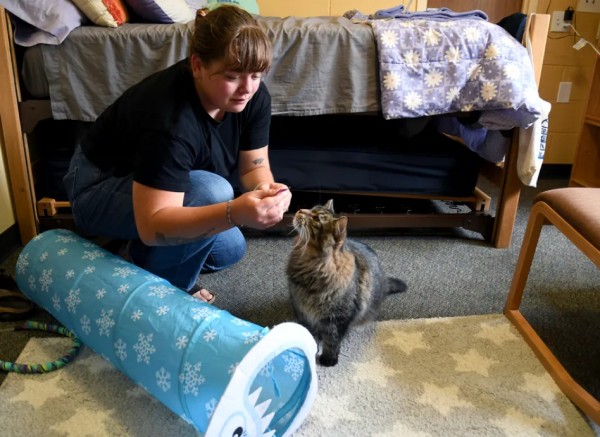 科罗拉多州立大学在十几栋宿舍楼中选三栋设为“猫狗友好专区”,今年秋天注册宠物数量创十年新高,该校规定宠物需满6个月、体重不超40磅(约18公斤),每名学生限养一只。