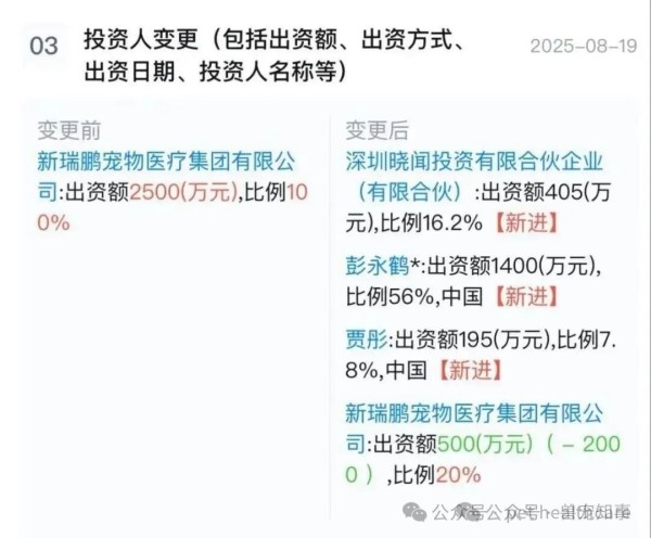 其本由新瑞鹏全资控股的企业——深圳市晓闻智慧医疗科技有限公司,在今年8月发生股权巨变:新瑞鹏持股比例骤降至20%,彭永鹤个人出资1400万拿下56%股权。
