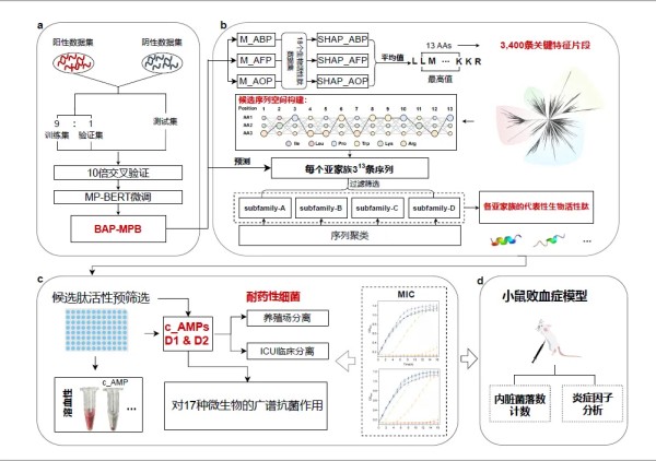 研究人员基于其团队构建的蛋白质大语言模型MP-TRANS,开发了系列活性肽的预测工具,实现通用蛋白质表征向抗菌肽设计任务的高效迁移。通过进一步引入SHAP可解释性分析,定量评估每一残基对抗菌、抗真菌及抗氧化活性的贡献,识别出高贡献特征片段,并通过重组构建出候选肽序列子空间。实验验证显示,筛选的16条肽中,有12条肽具备两种及以上生物活性,其中候选肽D1在体内外均表现出对多重耐药菌的显著抑制效果。该研究实现了“少样本、高精度”的抗菌肽理性设计,彰显了蛋白大语言模型与国产高性能计算在推动活性肽研究创新中的重要作用。