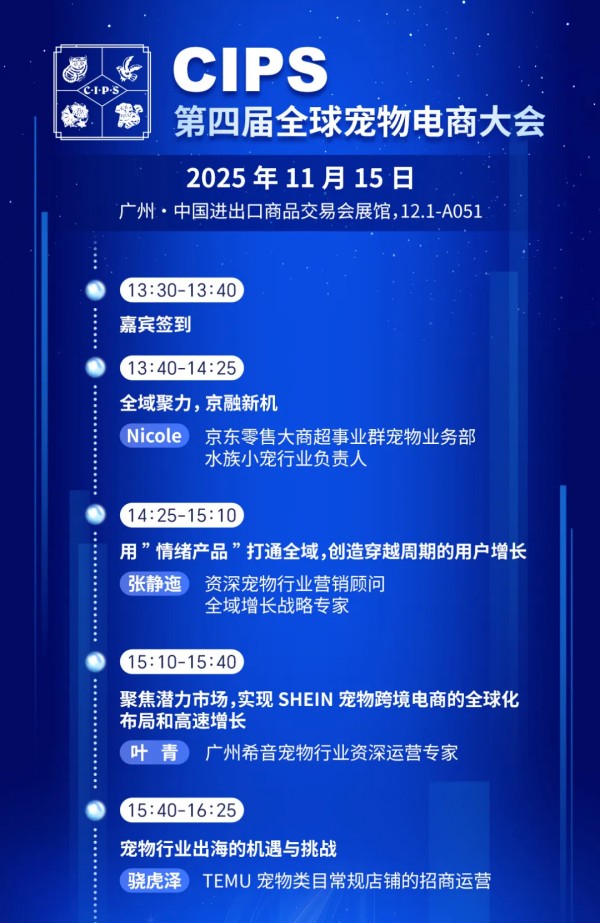 第29届中国国际宠物水族展览会(CIPS2025)将于2025年11月13-16日在广州•中国进出口商品交易会展馆B区(以下简称“广交会展馆”)举办。 同期活动——第四届全球宠物电商大会,将于11月15日正式启幕! 第四届全球宠物电商大会以“全域融通,开拓新市场”为核心议题,汇聚跨境电商头部平台的官方负责人与资深全域增长战略专家,聚焦选品策略、渠道布局、内容本地化三大关键板块,结合精选案例拆解真实成功打法,深入解析行业趋势数据与平台最新政策。以专业视角与实战经验,助力宠物品牌扬帆出海,拓展全球商业版图。
