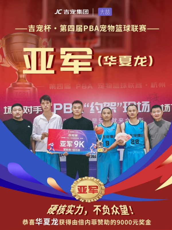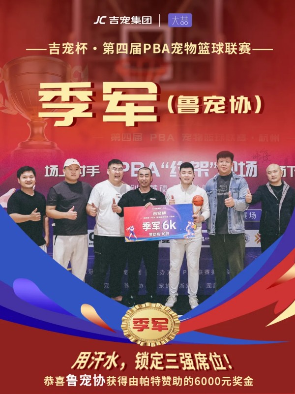 吉宠杯·第四届PBA宠物篮球联赛完美收官,八支队伍从线上"嘴强王者"变身线下"实战高手",在杭州·火箭熊篮球馆,上演了一场又一场巅峰对决。本次比赛中,鲁宠协荣获季军,团队53岁老将潘宗慧荣膺MVP。赣宠协队、华夏龙队、十方论坛队分别收获冠、亚、殿军。