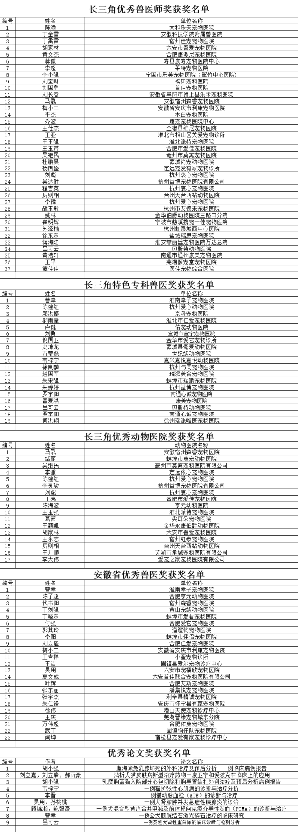 第八届长三角小动物医师大会暨安徽省小动物医师大会将于2025年11月12日-13日在安徽合肥丰大国际大酒店隆重召开,为激励广大兽医创新争优的工作热忱,推动兽医事业健康稳步地向前发展,会议期间特评选“长三角优秀兽医师奖”,“长三角优秀动物医院奖”“长三角特色专科兽医奖”“安徽省优秀兽医奖”“优秀论文奖”以奖励热爱兽医行业并作出杰出贡献的兽医们,现对以下获奖名单进行公示: