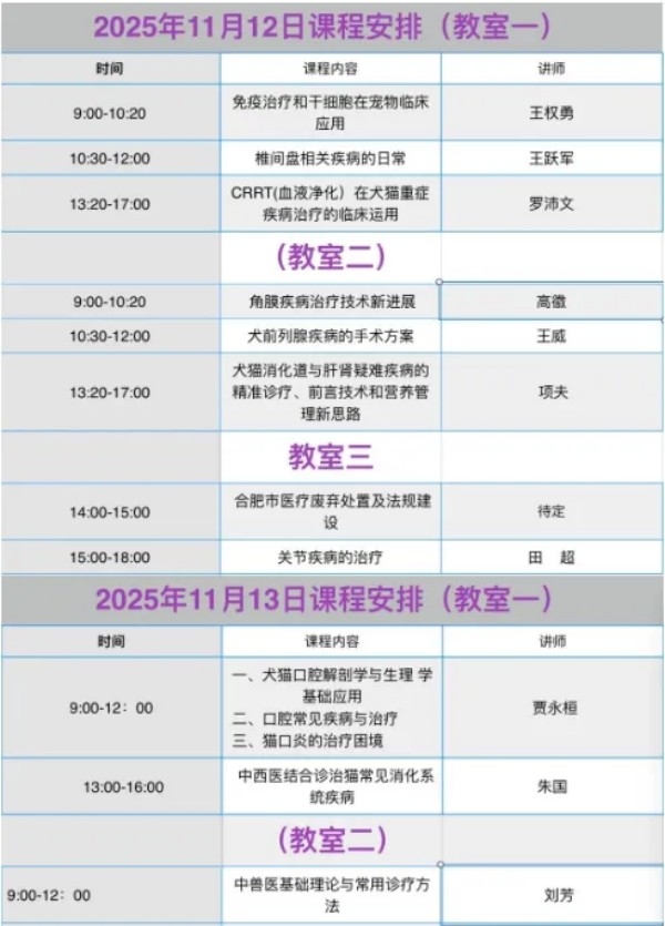 获奖人员要求:所有获奖人员现场领奖,否则视为放弃。 领奖时间: 1、长三角优秀兽医师、长三角特色专科医师、长三角优秀动物医院获奖者于:2025年11月12日上午8:30三楼国际厅按席卡就座现场颁奖, 2、安徽省优秀兽医师获奖者于2025年11月12日18:00晚宴现场颁奖。 联系人: 张院生 13485670287 会议课程安排: 参会人员扫码登记:免会议费、资料费、中餐盒饭