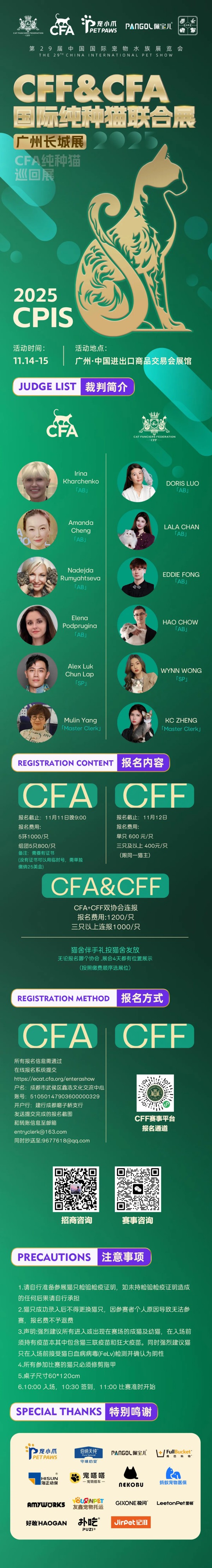 赛事一:“PANGOL佩宝儿”杯 IGC伴侣猫美容洗护师认证考试 暨CFF猫洗护美容巡回赛 时间:2025年11月13日 地点:广交会展馆 想看看猫咪如何变身“时尚icon”?这场洗护美容赛事绝对不能错过! 赛事二:CFF&CFA广州长城展 国际纯种猫联合展 时间:2025年11月14-15日 地点:广交会展馆 作为国际极具影响力的纯种猫赛事,CFF联合CFA强势来袭。汇聚全球顶级纯种猫同台竞技,上演一场颜值与血统的巅峰对决,堪称猫界“奥斯卡”!同时感谢宠小爪对此次大赛的倾力支持,宠小爪——“最懂繁育人的聚合服务平台”。