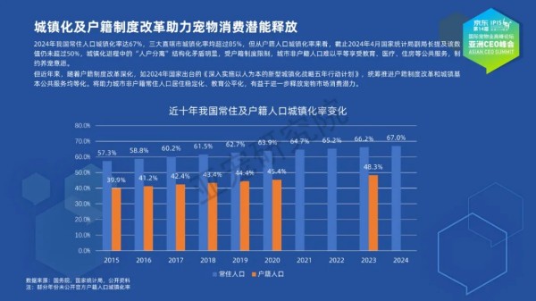 城镇化及户籍制度改革推动宠物消费潜力释放,2024年常住人口城镇化率67%,但户籍人口城镇化率仍不足50%。养宠数量低速攀升,犬猫活体数量预计增至1.87亿只,宠物老龄化趋势放缓,老龄宠物市场发展空间大。