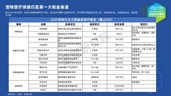 产业外企业加速宠物赛道布局,如阿迪达斯、中饮巴比食品、三只松鼠等纷纷跨界。宠物医疗保健仍是吸金赛道,2025年融资事件共14起,医疗保健领域6起。政府助力宠物产业集群化发展,全国多地披露宠物产业园区项目。