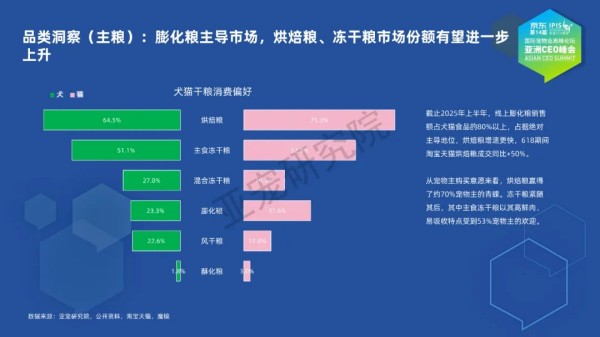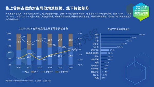 宠物主以女性、18至30岁青年轻群体为主,尽管收入收紧,但54%的宠物主表示会增加养宠消费。二线及以下城市养宠人群占比增至65%,市场进一步下沉。线上零售占主导但增速放缓,线下渠道持续复苏。