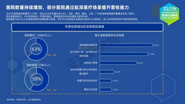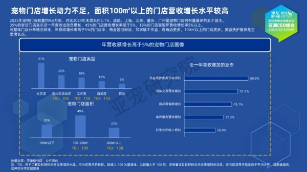 宠物门店数量增长乏力,年营收增长率高于5%的门店多为商业区沿街店、写字楼工作室、商场店,且面积多在100平方米以上。宠物医院数量持续增加,部分医院通过延深医疗场景提升营收能力。
