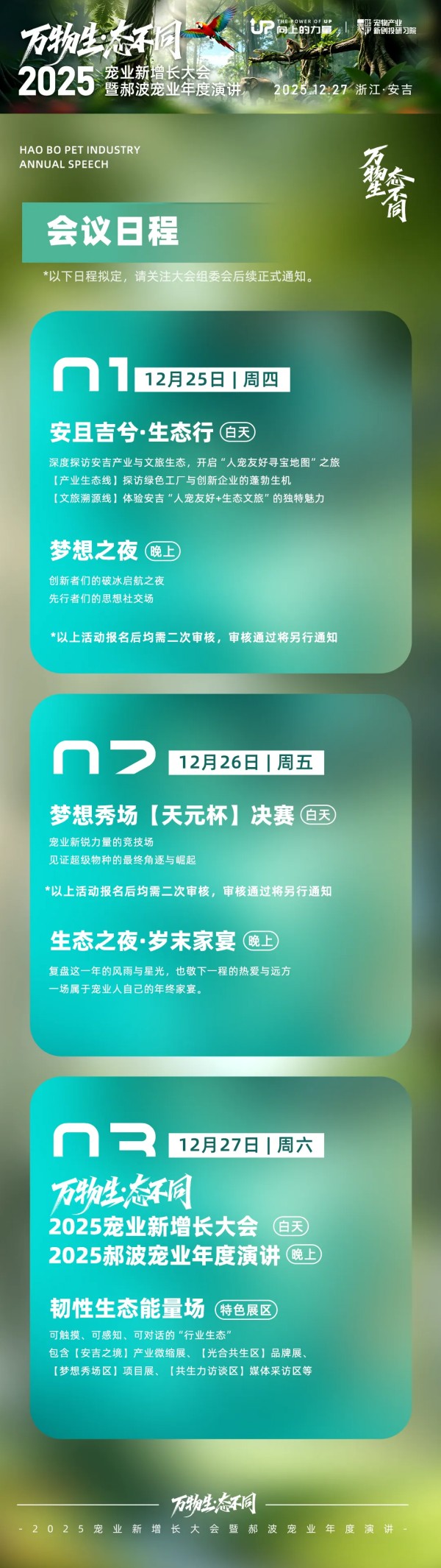 本届大会一改往年,大会全程12月25日-27日,为期三天。届时,现场将聚集来自政府、资本、学界及创新领域的各界领袖,为宠物产业的创新与发展注入强劲动力。 12月25日,大会前48小时,一场《安吉产业与文旅生态参访之旅》先行开展,深度探访安吉产业与文旅生态,开启【文旅溯源线】和【产业生态线】的旅程,体验安吉“人宠友好+生态文旅”的独特魅力; 12月26日,大会前24小时,将同期举办2025年度梦想秀场【天元杯】宠物产业新创投大赛总决赛,大赛将聚集初赛及复活赛超十五组优胜选手,登上梦想秀场全国总决赛舞台,角逐大赛最高荣誉,为2025宠业新增长大会再添创新热情与市场活力; 12月27日,"2025宠业新增长大会暨郝波宠业年度演讲"隆重启动,行业领袖、资深专家、跨界企业代表共聚一堂,聚焦行业结构重组、品牌多样化生长、个体力量觉醒等关键议题,共同探索宠物产业的增长逻辑与共态共生模式。 27日晚间,大会将迎来压轴重磅时刻,2025郝波宠业年度演讲正式开启,郝波老师将与大家分享2025的收获与成长,与现场嘉宾探讨行业新增长策略,共同构建开放多元的宠业生态新格局。这场年度盛会必将成为推动宠物产业创新升级的重要里程碑。 本次2025宠业新增长大会,将是一场深度将宠业品牌、创新与安吉文化融为一体的动态体验场。这里不只是单纯的会展现场,而是一片可触摸、可感知、可对话的“行业生态”。
