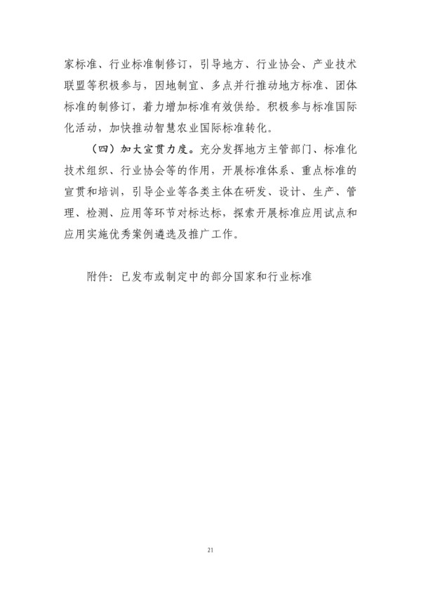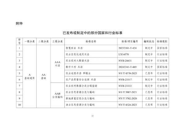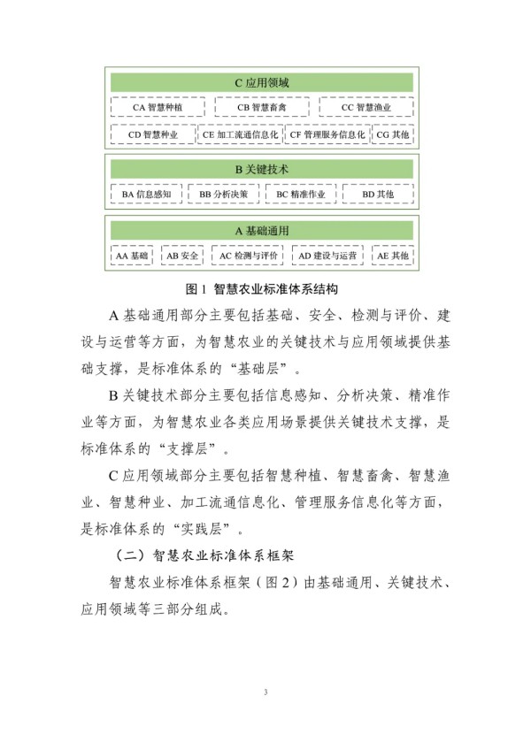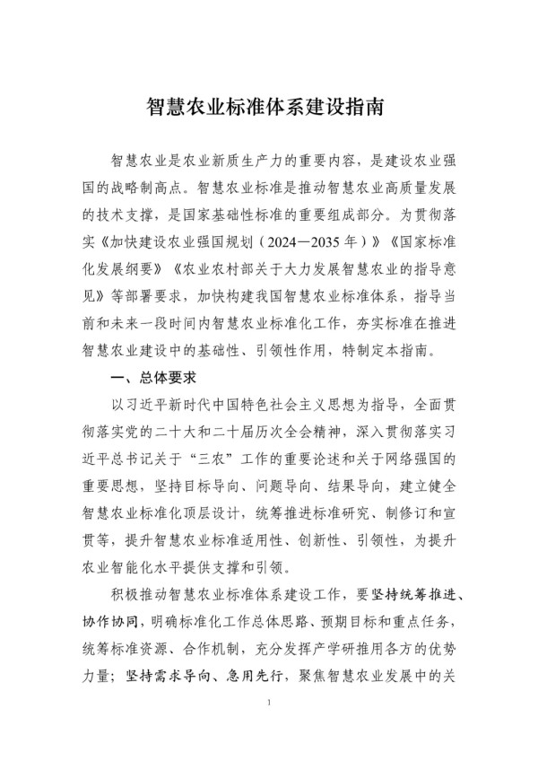 为推进智慧农业产业发展,加快构建我国智慧农业标准体系,提升标准化工作水平,夯实标准在推进智慧农业建设中的基础性、引领性作用,农业农村部农业信息化标准化技术委员会组织编制了《智慧农业标准体系建设指南》,经征求各方意见、修改完善后,现予发布。