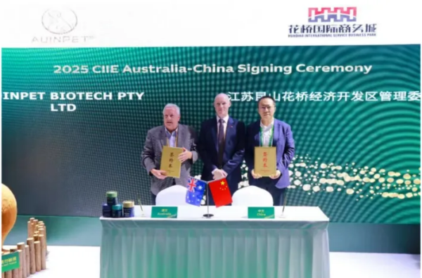 11 月 6 日,第八届中国国际进口博览会澳大利亚品牌馆内传来重磅消息—— 澳涞宠(Auinpet)与江苏省昆山市花桥经济开发区成功签约,正式敲定中国销售总部项目。这一举措标志着这家源自澳大利亚的高端宠物健康品牌,全面开启深耕中国市场的战略布局。