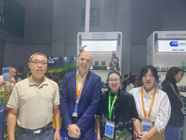 唐山怡安生物工程有限公司总经理孙晔、澳大利亚驻上海总领事馆马杰(John Madew)副总领事、国家兽药产业技术创新联盟副秘书长周盼伊、澳涞宠(Auinpet)创始人胡霏(Grace Hu)展位交流