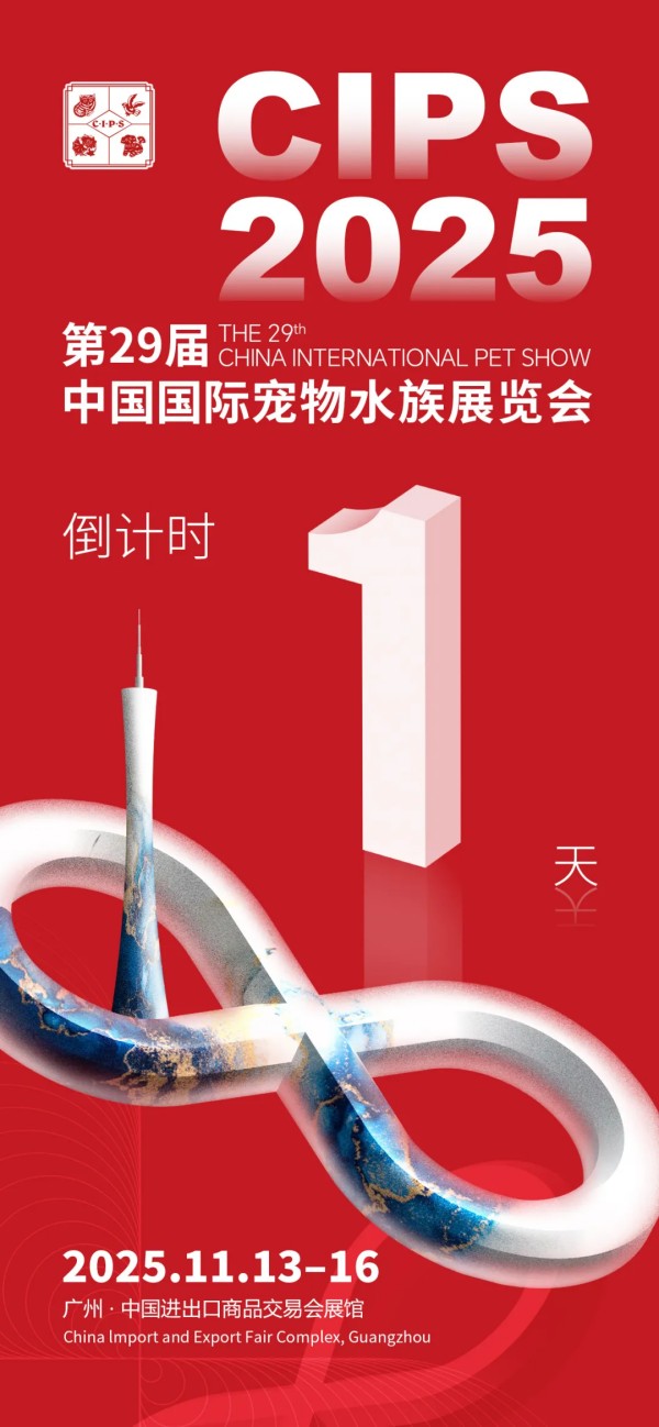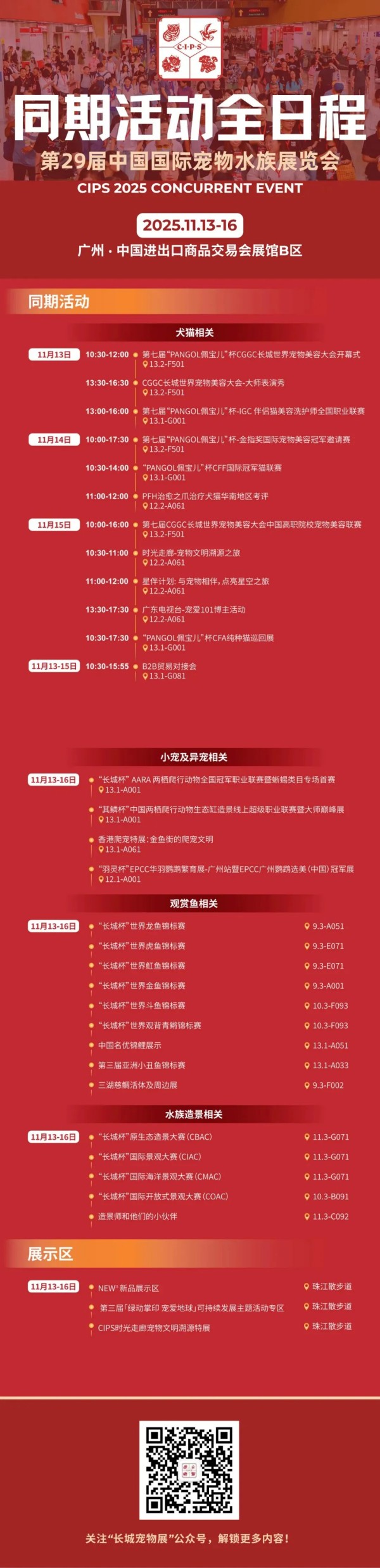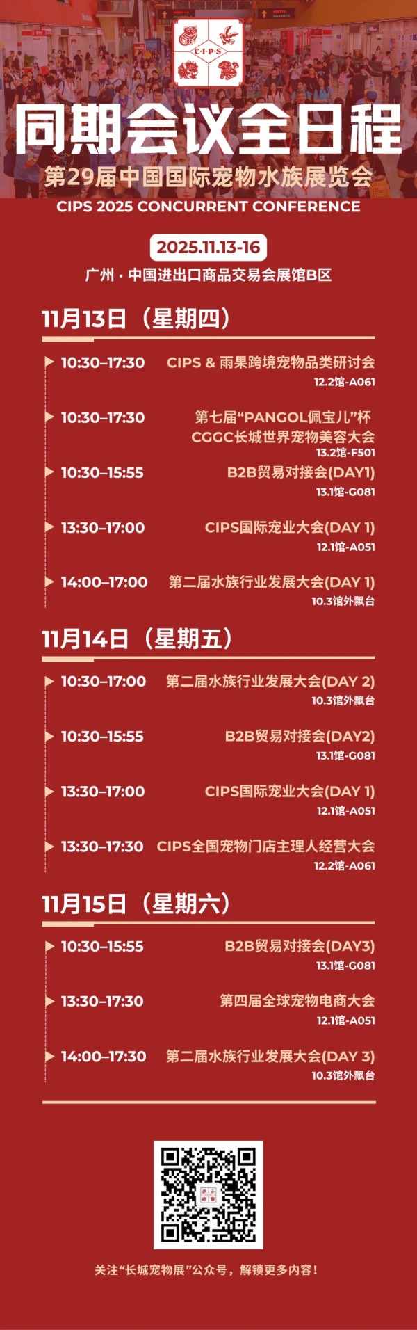 倒计时1天! 第29届中国国际宠物水族展览会 将于11月13–16日 在广州·中国进出口商品交易会展馆B区盛大开幕 羊城相聚,共赴盛会! 自1997年创办以来,中国国际宠物水族展览会CIPS(以下简称“长城宠物展”)已走过近三十载,从区域性展会成长为全球宠物与水族行业的重要会面点。本届主题为「无限 INFINITY」,寓意着联结全球、探索未来,也延续了长城宠物展“以行业为中心”的使命感。 长城宠物展作为国际宠物行业产业链重要对接平台,聚集全球宠物水族主力制造商并打造国际营销平台,吸引 120 多个国家行业人士到场贸易洽谈、探寻新品与行业动态。展会规模持续增长,更以优质买家结构著称 —— 不仅汇聚 Fressnapf、Cobasi、PetSmart 等全球行业头部采购商,更涵盖中东、东南亚等新兴市场专业观众,构建跨区域多层级全球采购网络,成为全球买家开拓新市场的首选平台。 ▲第二十八届长城宠物展部分活动现场回顾 本届十大展馆展位已售罄,100,000㎡展出面积,1,200+家优质展商,展会展品覆盖犬、猫、鸟、小宠、异宠、爬宠、水族等用品,全品类产品,链接数千品牌。 ▲宠物板块部分展商(排名不分先后) ▲水族板块部分展商(排名不分先后) 展会信息 展览时间 2025 年11月13-15日10:00-17:30(16:30停止入场) 2025 年11月16日10:00-14:00(12:00停止入场) 展览地点 广州 · 中国进出口商品交易会展馆B区 一层:12.1 13.1 二层:9.2 10.2 11.2 12.2 13.2 三层:9.3 10.3 11.3 地址:广州市海珠区阅江中路382号 ▲展区分布图 出行方式 【网约车出行】 打车出行打车至广交会展馆5号门、1号门、4号门,步行进馆。 专属福利:经与展馆协商,11月13-15日展期期间每日08:30-18:00,载有乘客的出租车可定位广交会展馆5号门直接进馆送客,下客点为AB区中平台下方,可有效缩短步行距离约300 米。闭馆前出租车能否进馆接人,将由展馆根据现场情况动态放行。为避免空车滞留,请司乘双方配合现场指引。 温馨提示:仅载客出租车可按现场指引自然放行,网约车暂不支持进馆;上午时段优先保障送客车辆通行,下午空车接客须视现场交通管控情况执行。 【公共交通】 优先乘坐地铁8号线(不建议乘坐11号线,会绕路)到达地铁琶洲站,从A口、B口出,步行进馆。 【自驾出行】 驾驶车辆经2号门驶入B区北广场,停车后从东面通道步行进入夹层。 本届展会提供专为受限行影响的展商/观众设置的场馆接驳大巴,临时交通管制等事项详情请看交通指南:CIPS2025交通全攻略|免费接驳、打车直达,一键到展! 入场须知 本次展览会所有人员都采取实名制登记,入场人员必须一人一证,请携带有效证件入场。 更多展会信息请查看:倒计时2天 | 关于CIPS2025的热门问题,官方解答来咯! 同期会议 更多活动信息请查看:倒计时14天 | 同期会议报名与参会指引 同期活动 更多活动信息请查看:倒计时14天 | 同期会议报名与参会指引 展位图 ▲一层:12.1、13.1馆 ▲二层:9.2、10.2、11.2、12.2、13.2馆 ▲三层:9.3、10.3、11.3馆 第29届中国国际宠物水族展览会 时间: 2025年11月13-16日 地址: 广州 • 中国进出口商品交易会展馆B区 广州市海珠区阅江中路382号 观众预登记火热进行中! ▲扫码免费观展 *完成预登记的专业观众,可免费入场参观。主办方未授权其它机构和平台进行票务销售,对在非官方渠道购买虚假参观票而引起的任何纠纷,长城宠物展主办方概不承担任何责任,并保留追究其相关责任的权利。 第29届中国国际宠物水族展览会 倒计时1天 诚邀您共赴宠业盛会,共同预见「无限」未来!