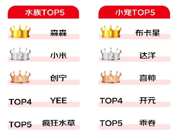 小宠TOP5品牌:布卡星、达洋、喜帅、开元、乖卷。