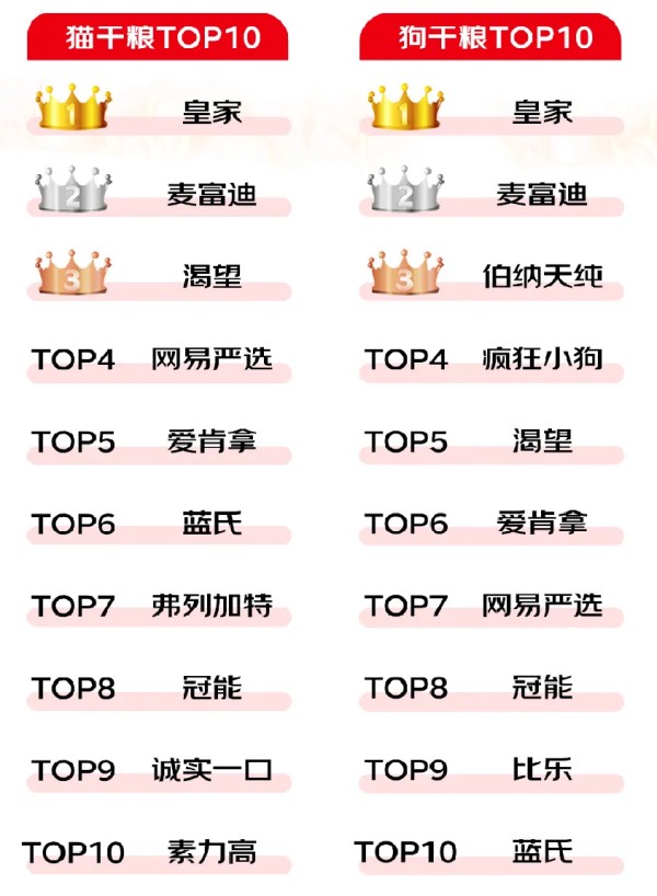 狗干粮TOP10品牌:皇家、麦富迪、伯纳天纯、疯狂小狗、渴望、爱肯拿、网易严选、冠能、比乐、蓝氏;