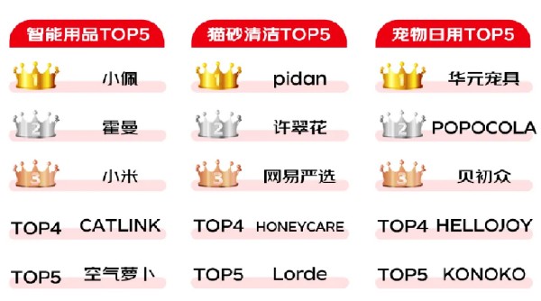 宠物智能用品TOP5品牌:小佩、霍曼、小米、CATLINK、空气萝卜;