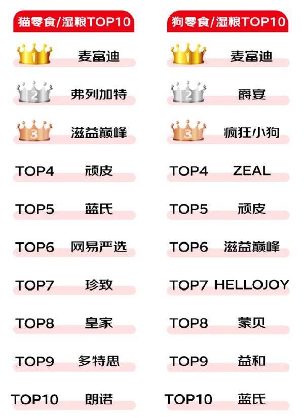 狗零食/湿粮TOP10品牌:麦富迪、爵宴、疯狂小狗、ZEAL、顽皮、滋益巅峰、HELLOJOY、蒙贝、益和、蓝氏;