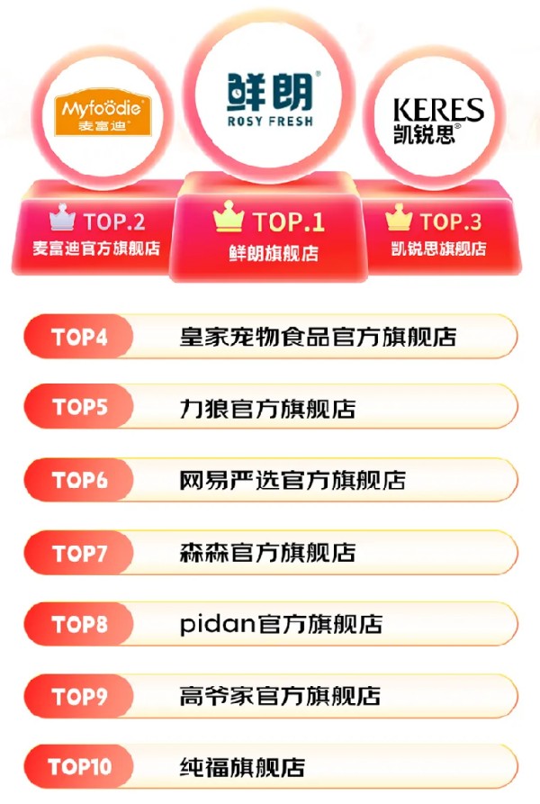 京东宠物POP店铺销售TOP10:鲜朗旗舰店、麦富迪官方旗舰店、凯锐思旗舰店、皇家宠物食品官方旗舰店、力狼官方旗舰店、网易严选官方旗舰店、森森官方旗舰店、pidan官方旗舰店、高爷家官方旗舰店、纯福旗舰店。