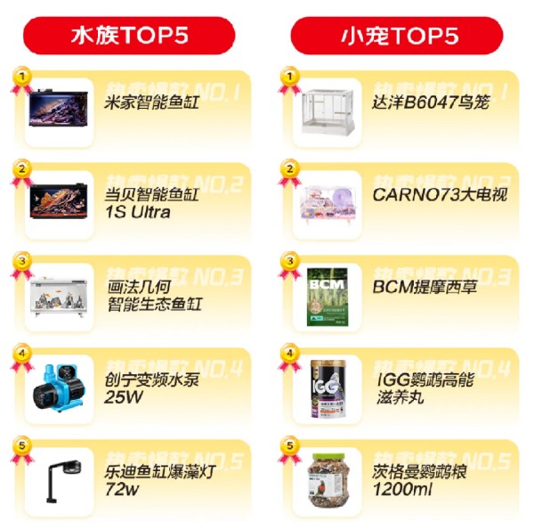 水族TOP5高增产品:米家智能鱼缸、当贝智能鱼缸1S Ultra、画法几何智能生态鱼缸、创宁变频水泵25W、乐迪鱼缸爆藻灯72w;