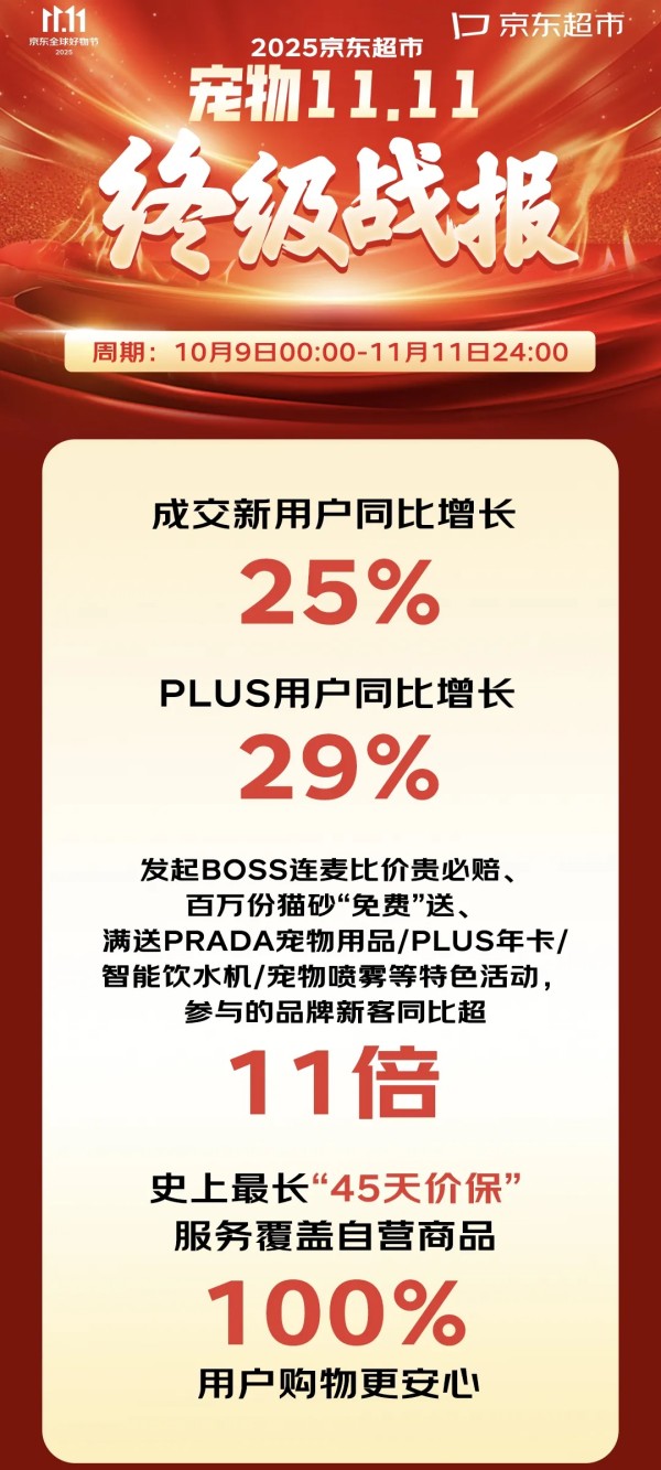 成交新用户同比增长25%;PLUS 用户同比增长29%;发起 BOSS 连麦比价贵必赔、百万份猫砂"免费"送、满送 PRADA 宠物用品/ PLUS 年卡/智能饮水机/宠物喷雾等特色活动,参与的品牌新客同比超11倍;史上最长"45天价保"服务覆盖自营商品100%,用户购物更安心。