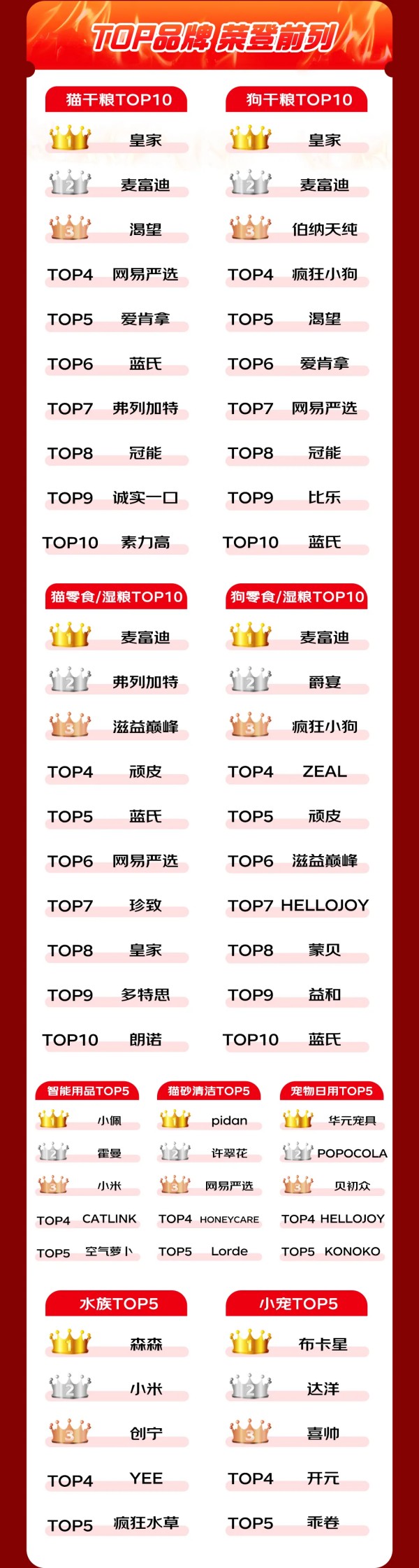 店铺TOP10:鲜朗旗舰店、麦富迪官方旗舰店、凯锐思旗舰店、皇家宠物食品官方旗舰店、力狼官方旗舰店、网易严选官方旗舰店、森森官方旗舰店、pidan官方旗舰店、高爷家官方旗舰店、纯福旗舰店