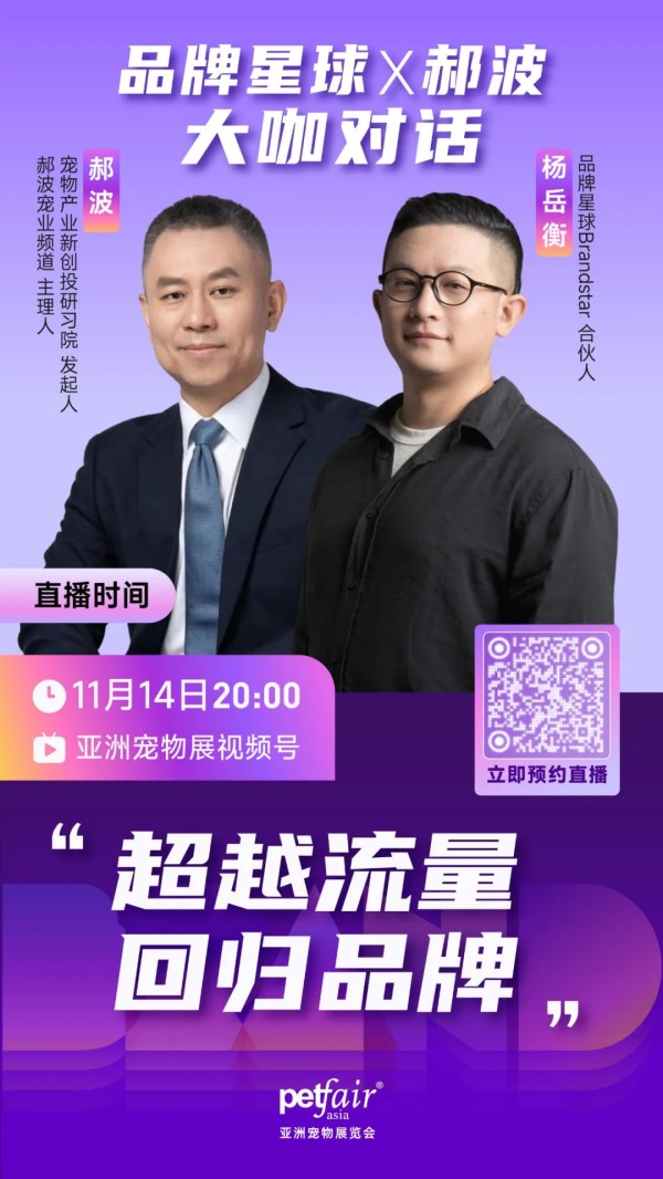 亚宠于2025年末亚宠华南展同期,联合品牌星球Brandstar,共同呈现“亚洲宠物行业品牌大会”,打造行业首个面向CMO/CBO的品牌盛会。11月14日今晚20:00,亚宠特邀宠物行业资深从业者、宠物产业新创投研习院主理人郝波先生与品牌星球合伙人杨岳衡先生展开超级对话,正式向行业宣告此次亚宠与品牌星球的深度合作,重磅预告12月4日的亚洲宠物行业品牌大会,并对这场将赋能宠物行业品牌化探索的行业盛会进行一轮前瞻。 两位直播嘉宾将通过当前宠物市场结构性变化及消费趋势,揭秘宠物行业首个品牌盛会的思考与价值,深度对谈品牌星球联手亚宠首度切入宠物赛道的契机。 对话主题 01 品牌星球的「品牌分析框架」 02 宠物行业目前处于品牌化哪个阶段? 03 品牌星球进入宠物行业最出乎意料的发现 04 从「纯卖货」到「打品牌」,最大的差别是什么? 05 一个宠物品牌从0到1,最应该先做好哪三件事? 06 除了主粮和零食,哪些细分品类最有可能长出强势品牌? 07 品牌星球如何看待「跨界品牌」(如阿迪达斯、蕉内)进入宠物赛道? 直播时间 11月14日 周五晚 20:00-21:30 直播频道 亚洲宠物展 郝波宠业频道