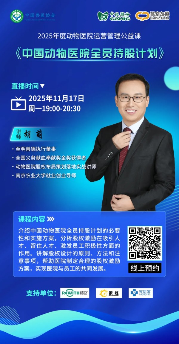 近年来,中国宠物市场规模持续扩大,2024年已突破3000亿元,动物医院作为宠物医疗服务的核心载体,数量呈爆发式增长。然而,行业快速发展的同时,也暴露出诸多问题:多数动物医院缺乏科学的运营管理体系,在营销推广上手段单一,难以吸引客户;服务流程不规范,导致客户流失严重;内部管理粗放,成本居高不下;战略定位模糊,制约了长远发展。 中国兽医协会立足行业痛点,联合中牧实业股份有限公司共同推出2025年度动物医院运营管理公益课,旨在通过专业课程培训,帮助动物医院提升运营管理水平,实现可持续发展。