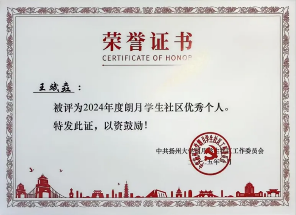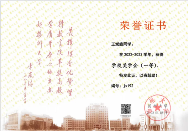 自2022年秋踏入扬大校园的那天,王斌垚的心中就明确了未来努力的方向,他渴望通过大学四年的耕耘,开启下一段学术旅程积蓄全部力量。在大一上学期,由于教学安排的调整,课堂常在线上与线下间转换。不少同学在这样的交替中松弛下来,王斌垚却始终绷着一根弦。那个期末,他凭借专业第二的成绩,初次展露头角。