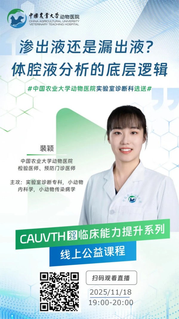 今晚19:00《CAUVTH2025临床能力提升系列线上公益课程 | 渗出液还是漏出液?体腔液分析的底层逻辑》 将由中国农业大学动物医院实验室诊断专科裴颖医生与大家分享!