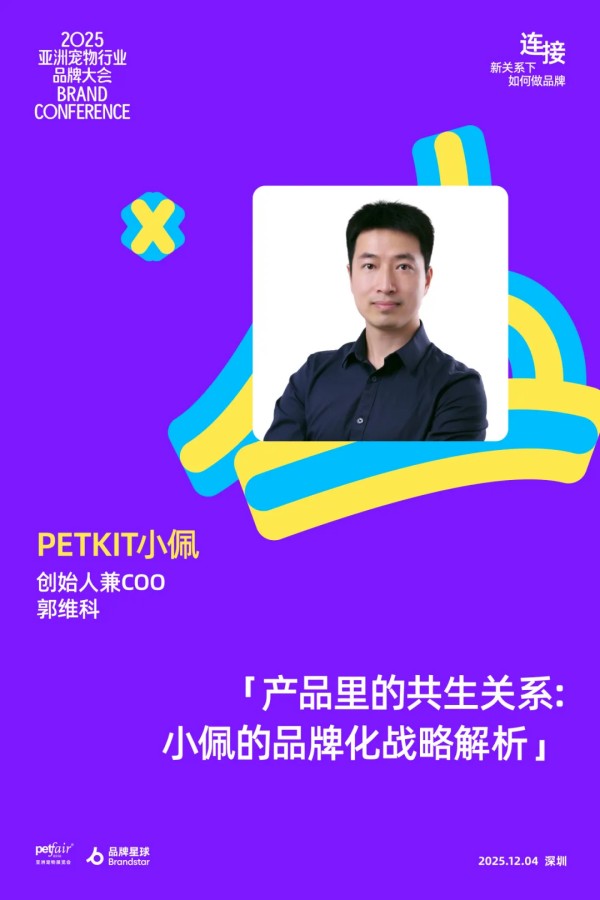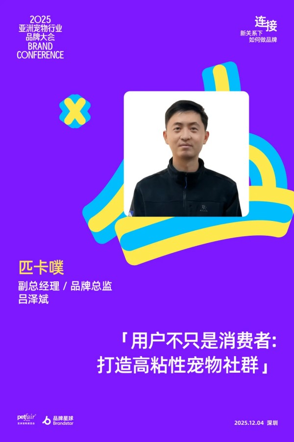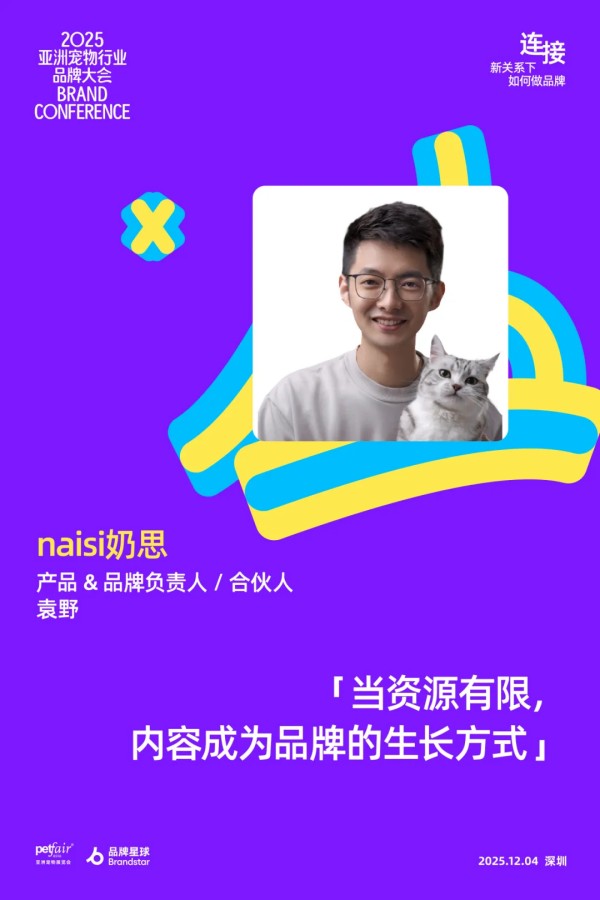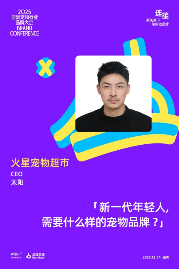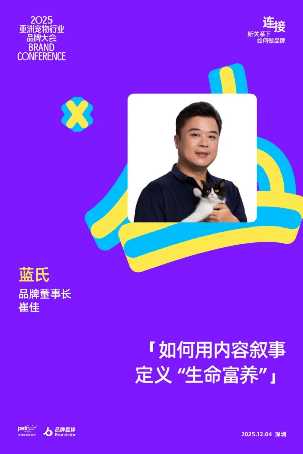行业新阶段的共生关系下,宠物品牌的塑造新路径,往往需要从品牌创始人的愿力开始,回到创始人的内心原点,找到那个核心的「为什么」。我们在探寻「确定性」和「不确定性」这两种可能的同时,将与品牌创始人,讨论品牌的共生可能。 杜欣芳 | 乖宝宠物CEO/麦富迪联合创始人 麦富迪(Myfoodie)是乖宝宠物食品集团旗下核心自主品牌,创立于2013年,现已发展成为中国宠物食品行业第一品牌(欧睿25年8月认证),成功推出霸弗天然粮、奶弗羊奶鲜肉粮、麦富迪原生鲜肉粮等特色产品。 郭维科 | PETKIT小佩创始人兼COO PETKIT小佩成立于2013年,是宠物科技健康领域的全球领先品牌。以“科技关怀宠物生活”为理念,产品远销全球180多个国家和地区,服务全球数百万宠物家庭。以物联网(IoT)和人工智能(AI)技术为驱动,构建一套完整的宠物智能健康生态系统。 杨岳衡 | 品牌星球Brandstar 合伙人 品牌星球Brandstar合伙人兼副总裁,负责品牌星球商业化和专业服务业务。13年连续的agency从业经验,曾在3家4A公司担任品牌策略、数字营销和专业管理工作,拥有丰富的品牌策略洞察与行业研究经验。 做品牌,先从做内容开始。在当下的品牌环境里,更积极、灵活的投入内容,是扭转品牌流量高企、营销效率下降的一种方法。而这个方法,正在被更多品牌企业所共识。 崔佳 | 蓝氏品牌董事长 蓝氏专注宠粮16年,深耕宠物食品行业赛道,遵循“尊重宠物天性”的本心,秉承着“用心做好宠粮”的初衷,坚持用人类的标准为标尺,致力于为中国养宠家庭提供最优质宠粮及服务。 袁野 | 产品&品牌负责人/合伙人 naisi奶思是成立于2019年的猫咪健康料理品牌。专注于猫咪饮食健康的研究,用人类食品级的原料,轻加工的工艺和专为室内猫咪设计的配方,给猫咪提供更加科学的饮食方案。 「如何捕获年轻人?」在宠物行业显得尤为重要,不仅仅是其他行业领域在意的话题,更因为宠物行业的「年轻人」,带着更为成熟的养宠观念和价值理念,是中国市场真正意义上的「第一代全生命周期的养宠人」。与他们建立关系,便有机会真正塑造第一代中国的宠物品牌。 于帅 | 贵为品牌创始人兼CEO GiGwi (贵为)品牌隶属于KIDS FIRST ASIA(通孚亚洲)集团,于2010年在香港创立。 品牌致力于向中高端宠物用品市场提供创新设计灵感,为爱宠提供安全、优质、创新的宠物玩具。 太阳 | 火星宠物超市CEO MARSMART火星宠物超市主理人。火星宠物超市是一个充满未来感、以火星基地为主题空间的宠物买手超市。打破传统宠物商店的形式,以宠物的第一视角,从体验路径出发,创造宠物自行购物的体验。 吕泽斌 | 匹卡噗副总经理/品牌总监 匹卡噗(PikaPoo),来自源飞宠物。源飞集团创立于1994年,30年来深耕于宠物用品与食品领域。匹卡噗(PikaPoo)是人宠美好生活方式品牌,是以情感为底色的宠物生活质造所,覆盖“吃·穿·住·行”等每一个日常场景。 * 更多重磅嘉宾持续更新,敬请期待