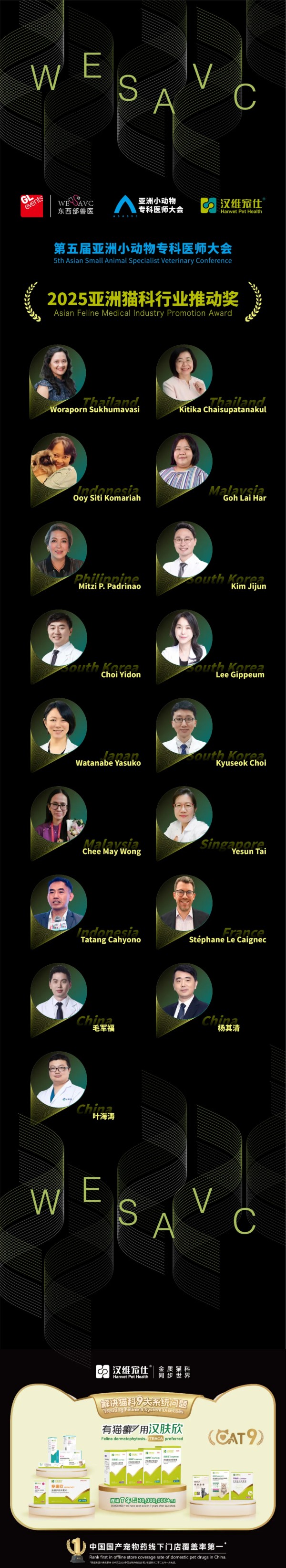2025亚专会高光时刻!17位兽医领军者荣膺 “亚洲猫科行业推动奖”。他们分别以国际视野引领行业革新,推动兽医诊疗规范落地,推广前沿技术,搭建跨区域专业交流平台。从行业标准制定到技术普及,每位推动者均以独立探索激活亚洲 “猫经济”,助力宠物猫医疗生态高质量发展,这份荣誉凝聚专业力量,共筑行业繁荣新未来!在这里也非常感谢汉维对此次活动的大力支持。