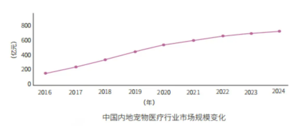 《2024中国宠物医疗行业白皮书》数据显示,2024年中国内地宠物医疗行业市场规模约735亿元人民币,约占整个宠物市场的24.5%。宠物医疗从2016年接近200亿元增长到如今的700多亿,在整个宠物市场规模占比呈现上升趋势。宠物医疗行业的快速发展,伴随着宠物人性化趋势的兴起、宠物饲养数量的增加以及人们对动物健康意识的增强。随着越来越多的人将宠物视为家庭的一部分,全球宠物药品支出激增。